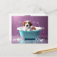 Det här vykortet har en söt toppen-valp i ett badkar med massor av tvålbubblor på lavendel - roligt och söt motiv för barn! Filmens födelsedag, babydusch, nyfödd baby med mera. Digital konst/AI-konst av AIbyMarion.