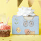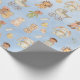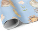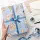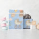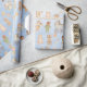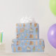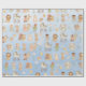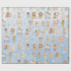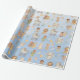 pappert med baby-emballering med vattenfärgat spädbarn i internationell med djur, sylt, flaskor, gummi, ankor, block och mjukisdjur på blå botten.