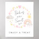 Cute whimsical boho flicka dusch tar ett poster med pastellfärgerna rosa och gult i en regnbåge, sol, hjärtan, stjärnor, måne och moln och "Spädbarn är sötat" i ett snyggt kalligrafiskt skript.