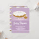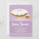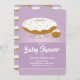 En söt inbjudan till matbabydusch som visar en leende, frostig, gig och en baby-donut-hål-karaktär. Inbjudan omfattar sprinkler och ett program för lila färg. Hela ord kan anpassas. Baksidan av inbjudan har en mönster av leende munkar. Sötsham Food Art Inbjudan till matbabybabybabyskor för matkonst i maten | ©Melissa Patton - Designer/Illustrator