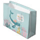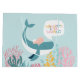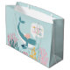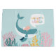 En babyduschpresentpåse med en söt val med ett spädbarn som sitter fast på ryggen och simmar genom havet och en färgstark uppsättning havsgräs och korall. Inkluderar talesättet "vad som händer i världen".