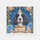 En glad illustration av en Spaniel hund som bär en festhatt, omgiven av ett färgglatt blomsterarrangemang och njuter av en festlig tårta, som ger en glad och festlig atmosfär.