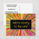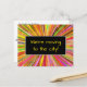 Denna roliga och färgglada design för vykort för adressändring har meddelandet "Vi flyttar till staden!" på framsidan och ett anpassningsbart meddelande på baksidan. Vykort som detta kan användas för att informera vänner och släktingar om att avsändaren har ett nytt hus.