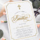 Modern, elegant dopinvitation med vit bakgrund, elegant guld kors, typsnittskrift Dop i trendig guld bokstav. För att redigera denna mall klickar du på anpassa ytterligare.