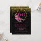 Fira en kvinna på 60-årsdagen med denna **Eleganta spanska 60-års inbjudan i svart, guld och rosa**. Med en sofistikerad svart bakgrund prydd med en glänsande guldram längst upp utstrålar denna inbjudan klass och distinktion. I mitten framhäver en gyllene hexagon vackra akvarellpeonior i levande nyanser av stark rosa och magenta, med siffran "60" tydligt visad i slående rosa. Evenemangsuppgifterna är elegant organiserade i en kombination av ljusa och starka rosa blockbokstäver, tillsammans med raffinerad kalligrafi, allt helt anpassningsbart för att passa dina önskemål.