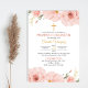 Invita a tus queridos a compartir esta ocasión sagrada con esta elegante invitación que presenta delicadas flores de färg durazno y un encantador sjuk de Cruz. Perfecta para Firar una primera comunión rodeada de familiares y amigos. Disponibel en español. Inbjudan dina kära till i helig tillfälle med denna inbjudan till elegant som innehåller ömtåliga blommor av persikoblommor och en charmerande kor. Perfekt för att fira en första heligans gemenskap omgiven av familj och vänner. Finns på spanska.