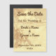Ett anpassningsbar Spara datum magneter-kort med reflektor och serif brev i brunt på en vintage som etsar handflatan träd på en sandstrand och vackra moln över lugnens hav vinkar i ljusbrun på en faux-församlingsbakgrund.