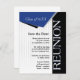 Det finns inga misstag - det här är en klassåterförening som sparar datumkortet. Den sofistikerade utformningen i blått, svart, silver och vitt är ett klokt sätt att tillkännage det kommande evenemanget. Diskret grått rand i bakgrunden tillför intresse och djup till utformningen.