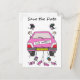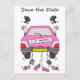 Den bakre änden av en rosa för tecknad med två buketter som kastas från framfönstren och kvinnliga skor som är bundna på baksidan av . Orden Spara datum skrivs ovanför bilden.