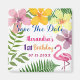 Luau, färgstarka, tropiska blommor och rosa flamingo 1:a födelsedag Spara datuminbjudningskortet.