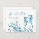 Meddela din förlovning med mitt "save our date" vykort med texten Save the Date i ett trendigt typsnitt som efterliknar handstilat text. Detta enkla vykort visar en kopia av mina originellt handmålade akvarellsjöhästar i olika nyanser av blått och turkos. Era namn, datum och vigselplats är satta i ett traditionellt seriff-skriftsnitt. Vykortets baksida har utrymme för adress. Perfekt för strandvigsel och destinationbröllop. För fler bröllopsteman av Victoria Grigaliunas besök DoTellABelle på Zazzle.