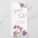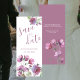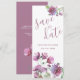 Spara datum Akvarell Lila Blommig Kort designad med ljusa lila blommor på vit bakgrund. Framsidans text innehåller: Spara datum, Brudens och brudgummens förnamn och bröllopsdatum. Baksidans text innehåller: Bröllopsplats och Formell inbjudan kommer, på lila bakgrund. För att anpassa, infoga bara dina uppgifter i vår enkla mall och ersätt exemptexten. Tillgänglig i tryck eller digital nedladdning.