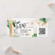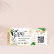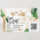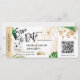 Destination Strand Bröllop Boarding Pass Biljett Guld Plan Spara datum med Kryssningsfartyg ikon med tropiska blad. Lägg till din QR-kod