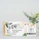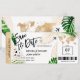Destination Strand Bröllop Boarding Pass Biljett Guld Plan Spara datum med hjärta och plan ikon med tropiska blad