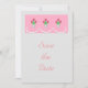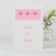 Utformningen är av tre bröllop-bouquets på en rosa bakgrund med rosa blommor i en vit, konformad hållare med meddelandet "Spara datum" nedan. Ett söt sätt att säga att vi är gifta sig, var snäll och spara datumet. Underbar blommigt för alla som gillar eller vill ha mycket rosa för bröllop.
