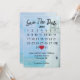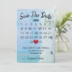 "Spara datum"-kalender med rött hjärta på en akvarell fyr och hav design för ett kommande bröllop.
