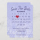 "Spara datum"-kalender med rött hjärta på pastellila snöflingmönster för kommande bröllop.