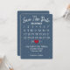 "Spara datum"-kalender med rött hjärta på en design med vita stjärnor och snöflingor för kommande bröllop.