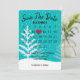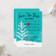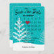 "Spara datum"-kalender med rött hjärta på turkos med vita snöflingor och träd för kommande bröllop.