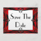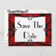 Romantisk "Spara datumet" på ett vykort med vit bakgrund för speciella tillfällen, fester och evenemangsinbjudningar. Bakgrunden är elegant med röda satinliknande ramar och en dekorativ original ramdesign i kontrasterande svart som inramar kortet vackert. Texten kan enkelt ändras och anpassas. Perfekt för kommande jul och högtider, bröllop, förlovning, årsdag och födelsedagsfester, etc. Baksidan kan också anpassas med mer text eller bara ta bort exempeltexten för att skriva för hand senare.