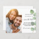Ett modernt och elegant foto Spara datum-kort. En chic vit bakgrund dekorerad med eukalyptus grönska. Anpassa och lägg till ditt foto och detaljer.