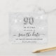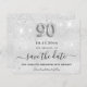 En elegant Spara datumkortet för en 90:e födelsedagsfest. En modern faux-metallisk tittar i silver som dekoreras med faux glitter stoft. Anpassa och lägg till datum och namn/ålder. Texten: Spara datumet skrivs med ett stort trendig-handskript i stil. Nummer 90 med ett stil-teckensnitt med ballong.