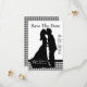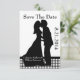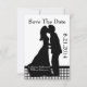 Charming bröllop spara datum-kort, i svartvitt, med ett svart och vitt gingham mönster och ett svart band som dekorerar grund på kortet och en svart silhuett av ett par kyssar i vintage stil i mitten. Texten i svartvitt är fullt anpassade och redo att anpassa sig efter ditt tillkännagivande från bröllop. Fint tillägg till vår inbjudan till Charming Silhouette Kissing Couple Wedingset.