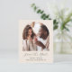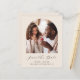 Den här enkla, minimalistiska Spara datumkortet har en boho-fotobåge ovanför orden "Spara datum" i ett vitt handskriftsskript i elegant, följt av parets namn, bröllop datum och stad i sans serif-teckensnitt på en beige bakgrund. Lägg till ett mer detaljerat meddelande med ytterligare information om det omvända.