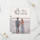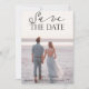 Den här "Spara datum"-inbjudan är idealisk för att visa familj och vänner förlovningens foton, med en kombination av serif och script typsnitt, och innehåller ett foto under svart text. Kortets baksida har samma bild av paret (utan text).