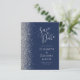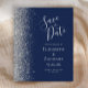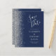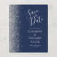 Det moderna bröllop spara datum-kortet från elegantens lämnat kant har ett silver faux glitter gräns. Med anpassadet kombineras handskrift och typsnitt från silver grått på en marin blå bakgrund. Den omvända sidan har en matchande marin blå och silver-design.