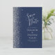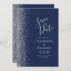 Det moderna bröllop spara datum-kortet från elegantens lämnat kant har ett silver faux glitter gräns. Anpassadet kombinerar handskrift, tryckplåt och kursivt typsnitt med silver grått på en marin blå bakgrund. Den omvända sidan har en matchande marin blå och silver-design.