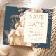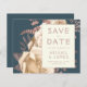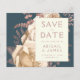 I elegant bröllop Spara datumkortet finns en lush, romantisk blommigt buquet i elfenben med faux-folie från ro och glitter på en tealblått bakgrund. Anpassa ro-färgad-texten i snyggt typsnitt på en elfenbensrektangel och lägg till bröllop webbplats-URL:en till den heldragna tealen.