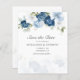 Vattenfärgkort för blommigt i elegant, dammigt blått, vitt och marint blommigt bouquet bröllop spara datum kort. Kortet innehåller ett skript "Spara datumet" som kan ändras till en typsnittstyp som du väljer och som är tillgänglig här när du klickar på knappen "Anpassa".