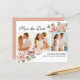 Tre av dina pars foton placeras i ett band i mitten av datumkortet. Dusty rosa ros på grönt eucalyptus lövs ger en diagonal blommigt accent. Spara datumet skrivs i ett formellt skript i det övre hörnet av högerna. Namn, datum och plats för bröllop ligger i grund högernas hörn.