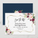 Charming Burgundy, utformning av Marsala-Blommigten. Den har en fantastisk Burgundy, blommigt med vattenfärg bouquet, modern handstil "spara datumskript", unika blommigt-pilar med hjärtan som delare, allt på vit bakgrund; på baksidan en marin blå bakgrund och en blommigt bouquet. Använda Anpassa verktyg om du vill lägga till din information. Om du vill ha matchande objekt går du till min Burgundy Bloom Blommigt Collection.