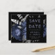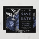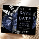 Den här eleganten har det moody bröllop spara datum-kortet en lush, romantisk blommigt bouquet i marinblått med silver faux foil och glitter löv på svart bakgrund. Anpassa silver grått och dammig blå text i snyggt typsnitt på en svart rektangel och lägg till webbadressen för bröllop till den helsvarta baksidan.