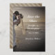 Filtret Fog släcker en spotlight-effekt med den här Bröllop-paret, ge Bride och Groom på Sunset Beach Sparar det platta datumkortet. Du kan ändra detta för fotot eller behålla till det vackra bröllop-fotot som finns i den här mallen. Kortets baksida har ett diagonalt mönster med grått-randig diameter som matchar en del av sandens färg.