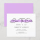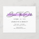 Spara datuminbjudningskortet med budgeterat, modernt, minimalistiskt skript med Spara datum i ett svart skript på eleganten över ett modernt lila på en vit bakgrund med Spara datuminformationen nedan. Anpassa genom att redigera texten i textrutorna. Designad för dig ©Evco Studio www.zazzle.com/store/evcostudio