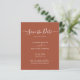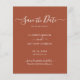 Den budgeterade eleganten manuset minimalistisk modern icke-fotobränd orange jordfin terracotta rust boho öker bröllop spara datum-annonsering personlig till ett överkomligt pris för lågbudgetflygare. En ren designmall har en kursiv elegant med texten "Spara datum". Den här klassiska kortets perfekt för ett par som vill ha ett traditionellt datum för att spara datumet med ett modernt tryck, utan foto. Kontakta designern om du behöver hjälp eller matchande artiklar.
