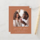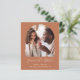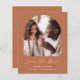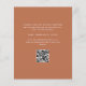 Den här enkla, minimalistiska Spara datumkortet har en boho-fotobåge ovanför orden "Spara datum" i ett vitt handskriftsskript i elegant, följt av parets namn, bröllop datum och stad i sans serif-teckensnitt på en terracotta-bakgrund. Lägg till ett mer detaljerat meddelande med ytterligare information om motsatsen, tillsammans med en QR-kod som skickar gästerna till webbplatsen för bröllop.