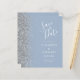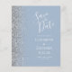 Det moderna bröllop spara datum-kortet från elegantens lämnat kant har ett silver faux glitter gräns. Anpassadet kombinerar vit handskrift och typsnitt på en dammig blå bakgrund. Den omvända sidan har en dammig blå och silver-design.