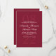 Elegantens snyggt är utformad med briden och triomens namn i det vita elegantens skript stil och detaljer i det vita klassiska serif-teckensnittet stil med stort datum i ljusburgunrött som bakgrund på dold bakgrund.