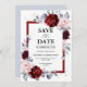 Burgundy dammig rosa-skiffer: blommigt bröllop spara datum-kort med elegant bouquet av burgundy, vin, dammblått, , ro och peonblomknoppar och dammig grönt eucalyptus löv och röd faux glitter neutralt ram . Kontakta mig om du behöver hjälp med anpassning eller om du behöver någon annan produkt med den här designen