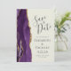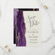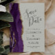 Det moderna bröllop spara datum-kortet från elegantens lämnat kant har en lila vattenfärgsagat gräns som trimmas med faux guld glitter. I anpassadet kombineras grått-handskrift, kopparplåt och kursivt typsnitt på en elfenbensbakgrund. Den omvända sidan har en matchande lila- och guld-agate-design.