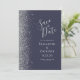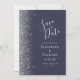Det moderna bröllop spara datum-kortet från elegantens lämnat kant har ett silver faux glitter gräns. Med anpassadet kombineras handskrift, tryckplåt och kursivt typsnitt med silver grått mot en mörk blått bakgrund. Den omvända sidan har en matchande design i blått och silver.