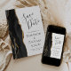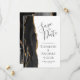 Det moderna bröllop spara datum-kortet från elegantens lämnat kant har en svart vattenfärgad agate gräns som trimmas med faux guld glitter. Med anpassadet kombineras grått-handskrift, tryckplåt och kursivt typsnitt på vit bakgrund. Den omvända sidan har en matchande svartvit och guld agate-design.