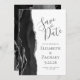 Det moderna bröllop spara datum-kortet från elegantens lämnat kant har en svart vattenfärgad agate gräns som trimmas med faux silver glitter. Med anpassadet kombineras grått-handskrift, tryckplåt och kursivt typsnitt på vit bakgrund. Den omvända sidan har en matchande svartvit och silver agate-design.