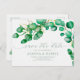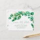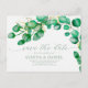 Ett vykort i elegant spara datum meddelande innehåller en mängd strålande accent-vattenfärgseukalyptus som fyllts med grönt, guld löv, grenar och guld.