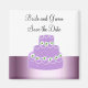 En söt som innehåller en lila bröllop-kaka med blommor i vitt med grönt och mjuk vit isning. En gräns av skuggad lila. Anpassa med namn och datum efter behov.