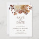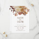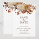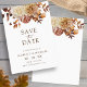 Det här spara-till-datum-kortet för elegant har handmålad vattenfärgsbränd orange och terracotta löv, grädde och beige dahlias arrangerad som en vacker bukett. Sök efter matchande objekt i Romantik-samlingar hösten.
